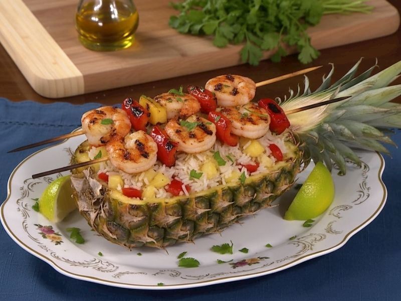 • Şişlerdeki karidesler ve sebzeleri, ananasın içine dikkatlice yerleştirin. Üzerine taze kişniş veya yeşil soğan ile süsleyerek sunun. Afiyetle yiyin!