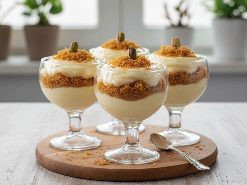 Servis yapmadan önce, kaselerin içine önce kızarmış kadayıfın yarısını yerleştirin. Üzerine hazırladığınız kremayı dökün ve kalan kadayıf ile kapatın. Son dokunuş olarak, üzerine fındık veya ceviz serpiştirin ve buzdolabında en az 1-2 saat dinlenmeye bırakın. Bu sayede, tatlar daha iyi bütünleşir ve lezzeti artar. Afiyet olsun!